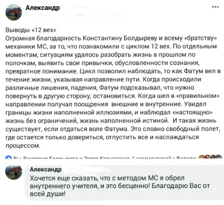 Огромная благодарность Константину Болдыреву и всему «братству» механики МС, за то, что познакомили с циклом 12 вех. По отдельным моментам, ситуациям удалось разобрать жизнь в прошлом по полочкам, выявить свои привычки, обусловленности сознания, превратное понимание.