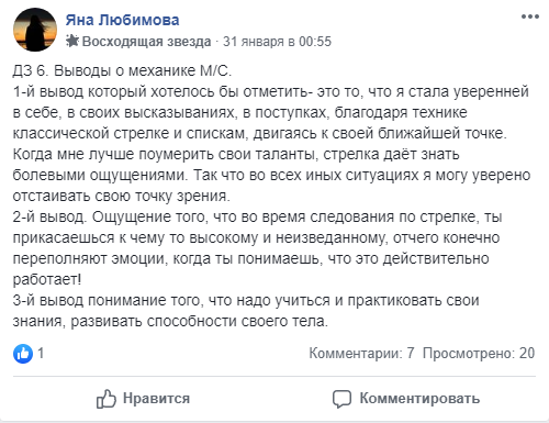 ДЗ 6. Выводы о механике М/С. 1-й вывод который хотелось бы отметить- это то, что я стала уверенней в себе, в своих высказываниях, в поступках, благодаря технике классической стрелке и спискам, двигаясь к своей ближайшей точке. Когда мне лучше поумерить свои таланты, стрелка даёт знать болевыми ощущениями. Так что во всех иных ситуациях я могу уверено отстаивать свою точку зрения. 2-й вывод. Ощущение того, что во время следования по стрелке, ты прикасаешься к чему то высокому и неизведанному, отчего конечно переполняют эмоции, когда ты понимаешь, что это действительно работает! 3-й вывод понимание того, что надо учиться и практиковать свои знания, развивать способности своего тела.